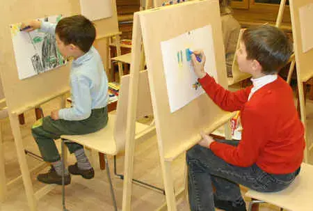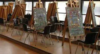 Мольберты (15 шт.), этюдники (15 шт.), столы, стулья, стенды для творческих работ, рамы с паспарту для выставок, бумага (формата А3, А4, А2), гуашь, акварель, кисти, восковые мелки, уголь, сангина, перо, тушь, цветная бумага, картон, ножницы, клей, пеленг для показа слайдов, слайды и репродукции с картин художников, графиков, скульпторов, архитекторов, презентации о художниках и из работах, дощечки для лепки, глина, пластилин, стеки для лепки, геометрические фигуры и пособия (отдельные детали-образцы).