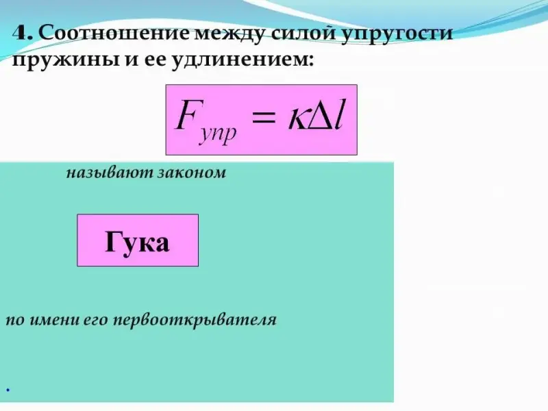 - Соотношение между силой упругости Fупр пружины и ее удлинением k: ... (формула) называют законом ... (Гука) по имени его первооткрывателя