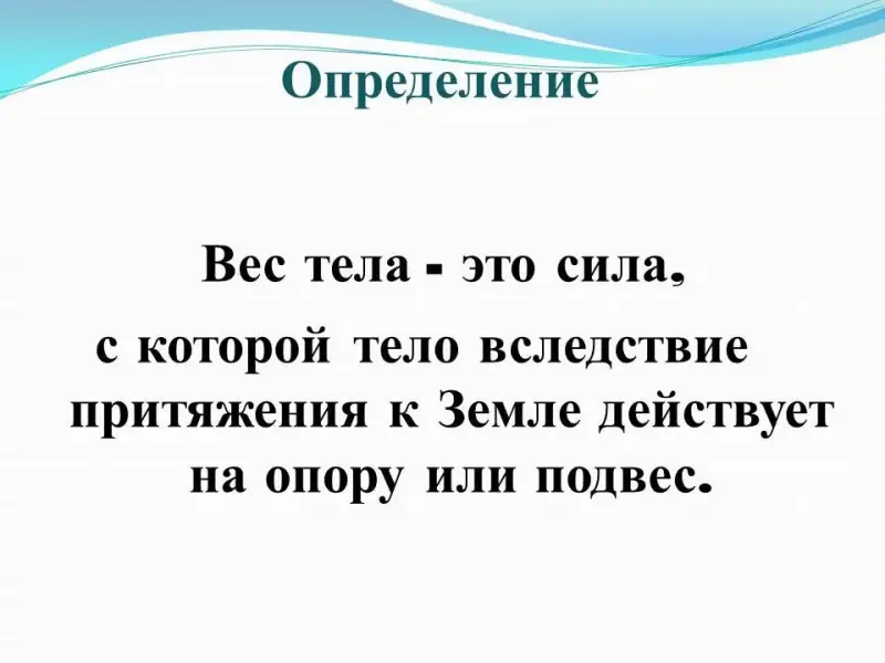 Итак, Вес тела - это сила, с которой тело давит на свою опору или растягивает подвес, вследствие земного притяжения.