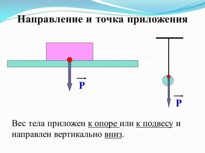Если Вес - это сила, значит это какая величина: векторная или скалярная? Правильно! Вектор. Каково направление веса тела? Чтобы ответить на этот вопрос, вспомним направление силы тяжести. Правильно, сила тяжести всегда направлена вертикально вниз, значит и вес тела тоже, так как эта сила возникает вследствие притяжения к Земле.