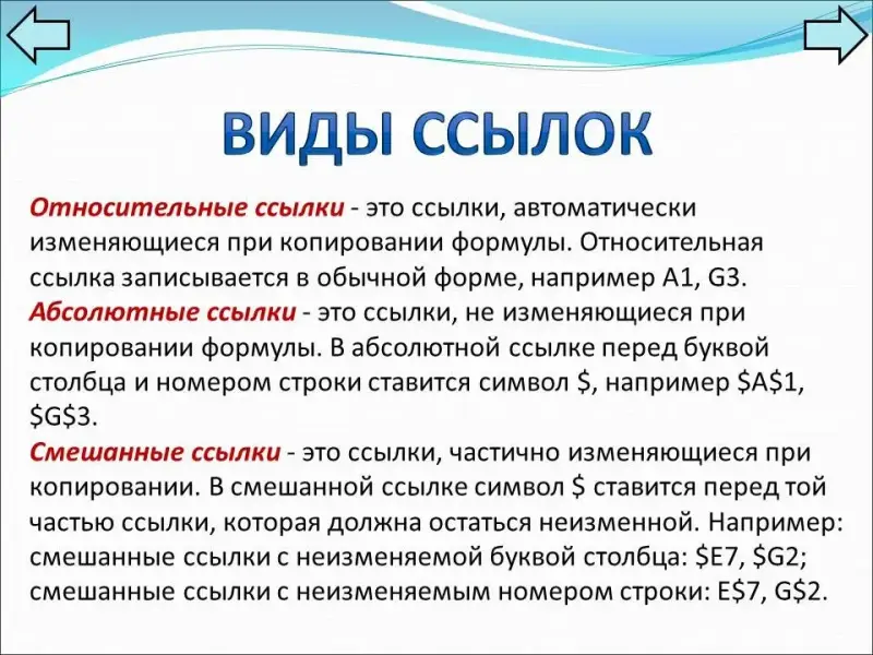 Относительные ссылки - это ссылки, автоматически изменяющиеся при копировании формулы. Относительная ссылка записывается в обычной форме, например А1, G3.