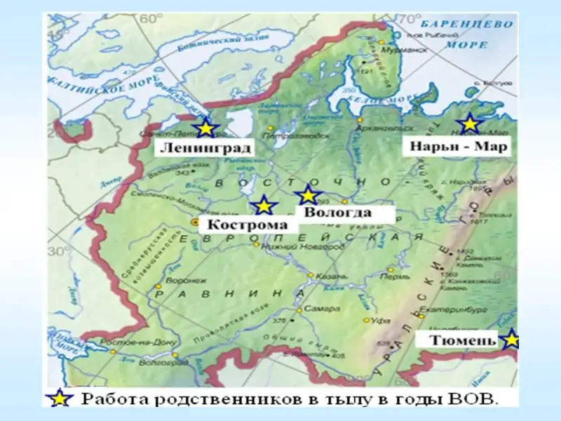 Слайд 37. (Карта на которой звездочками отмечены места работы родственников в тылу).