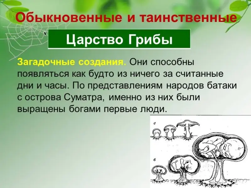 Загадочные создания. Они способны появляться как будто из ничего за считанные дни и часы. По представлениям народов батаки с острова Суматра, именно из них были выращены богами первые люди. О какой группе организмов идёт речь? Учащиеся высказывают предположения.