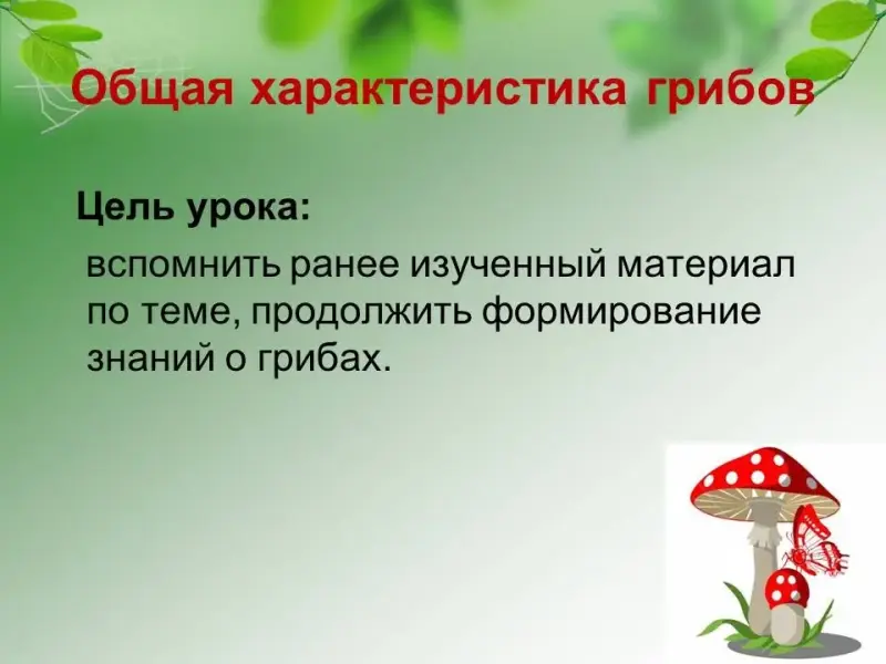 Цель - сформировать знания об особенностях организации грибов, их роли в природе и жизни человека.