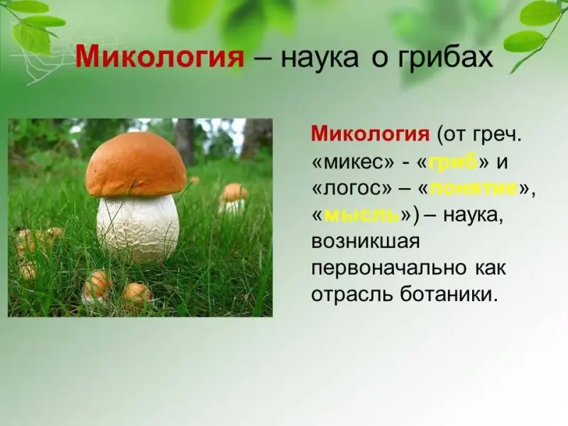Микология - наука о грибах. Микология (от греч. "микес" - "гриб" и "логос" - "понятие", "мысль") - наука, возникшая первоначально как отрасль ботаники.