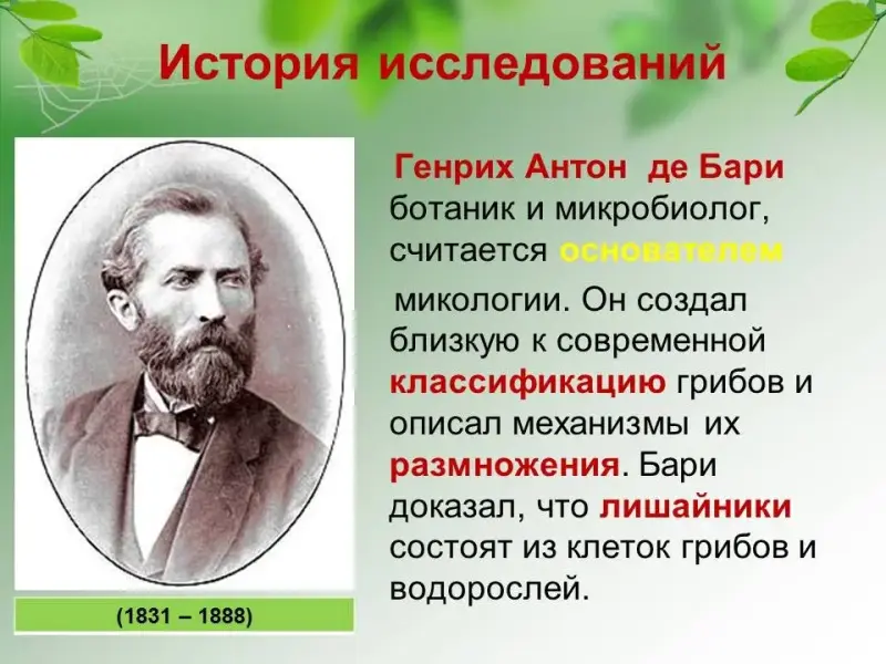 Генрих Антон де Бари (1831 - 1888) ботаник и микробиолог, считается основателем микологии. Он создал близкую к современной классификацию грибов и описал механизмы их размножения. Бари доказал, что лишайники состоят из клеток грибов и водорослей.