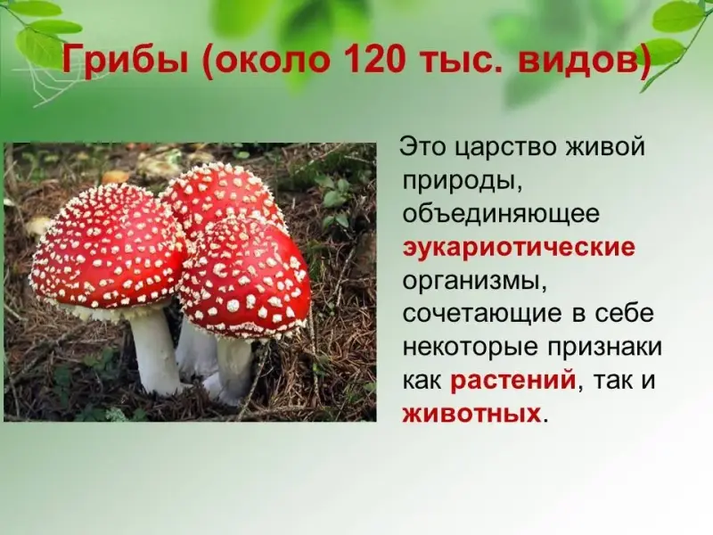 Сейчас известно около 120 тыс. видов грибов. Грибы - это царство живой природы, объединяющее эукариотические организмы, сочетающие в себе некоторые признаки, как растений, так и животных.