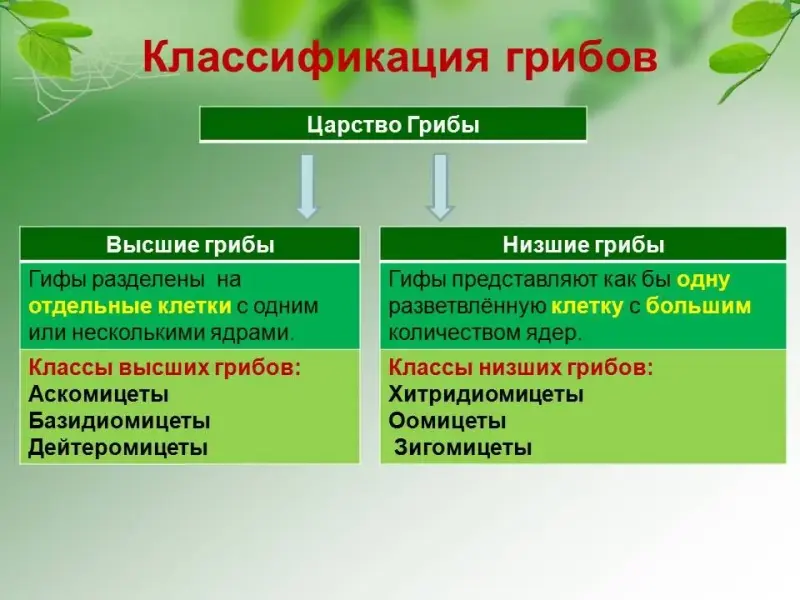 По строению мицелия и особенностям размножения грибы делят на низшие и высшие. У низших грибов мицелий неклеточный. Он представляет собой как бы одну сильно вытянутую и разветвлённую клетку. Классы низших грибов: Хитридиомицеты, Оомицеты, Зигомицеты. У высших грибов гифы разделены на отдельные клетки с одним или несколькими ядрами. Классы высших грибов: Аскомицеты, Базидиомицеты, Дейтеромицеты.