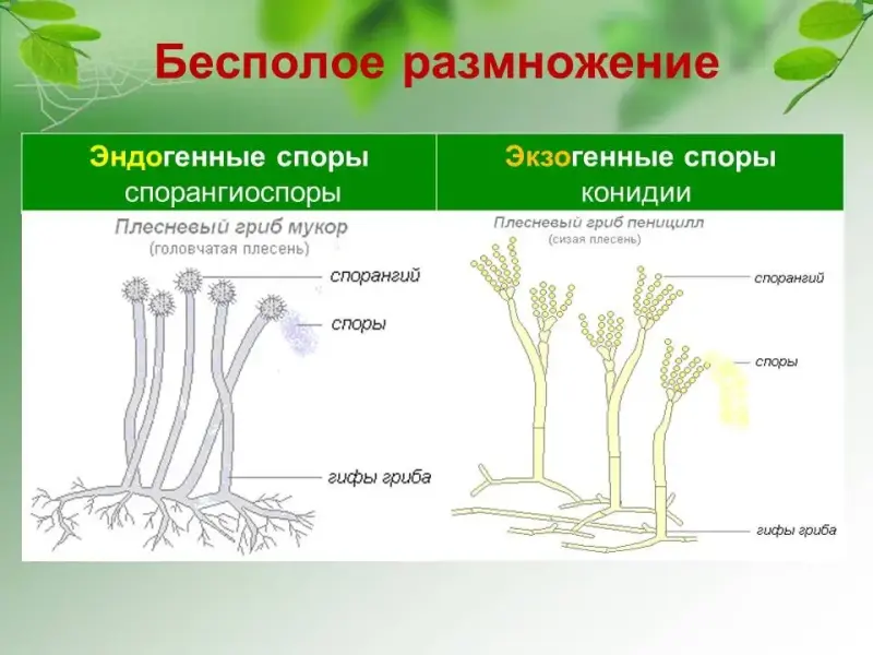 Собственно бесполое размножение идёт посредством спор. Эндогенные споры образуются внутри специальных органов спороношения, называемых спорангиями. Характерны для низших грибов. Экзогенные споры (конидии) образуются на вершинах или сбоку специальных гиф - конидиеносцев. Характерны для высших и некоторых низших грибов. Вегетативное размножение происходит частями мицелия, у дрожжевых грибов - почкованием.