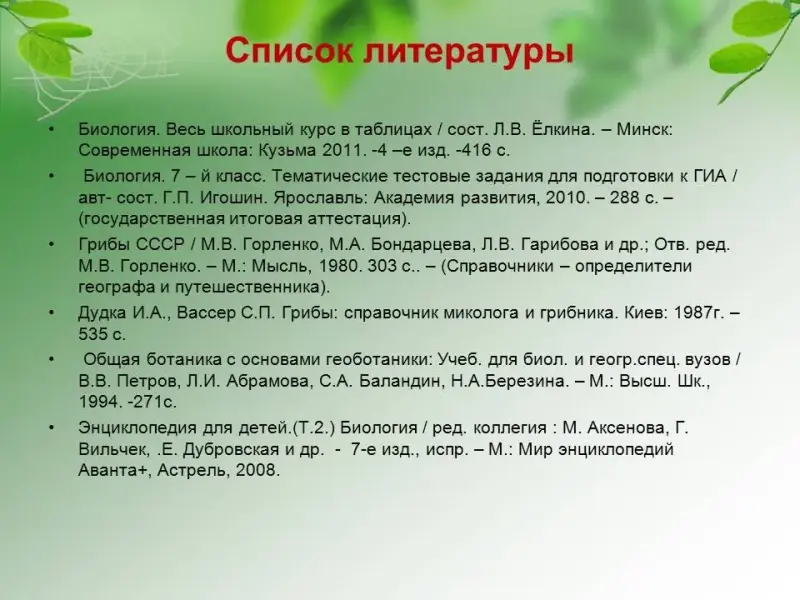 - Захаров В.Б., Сонин Н.И. Биология. Многообразие живых организмов: учебник для 7 класса средней школы. М.: Дрофа, 2004, 2006.