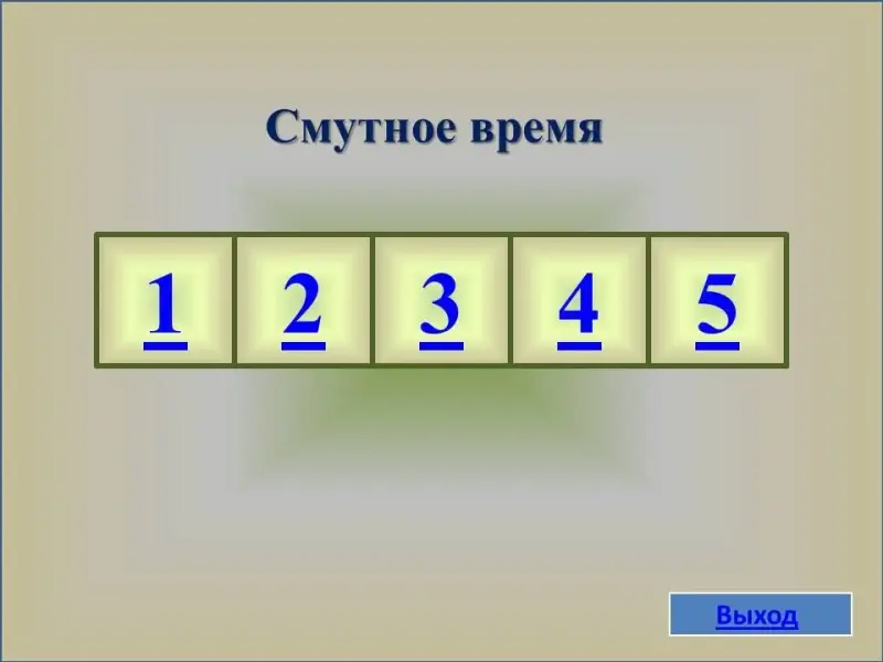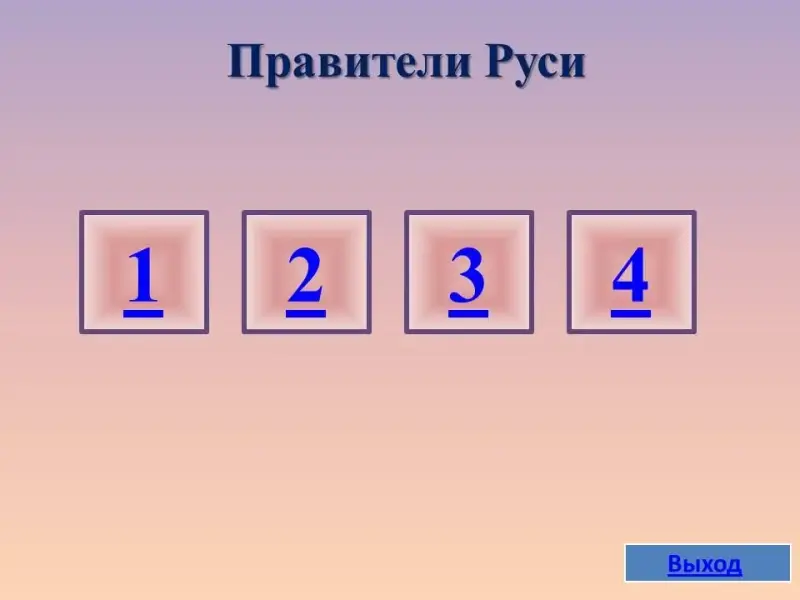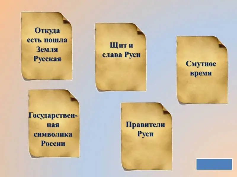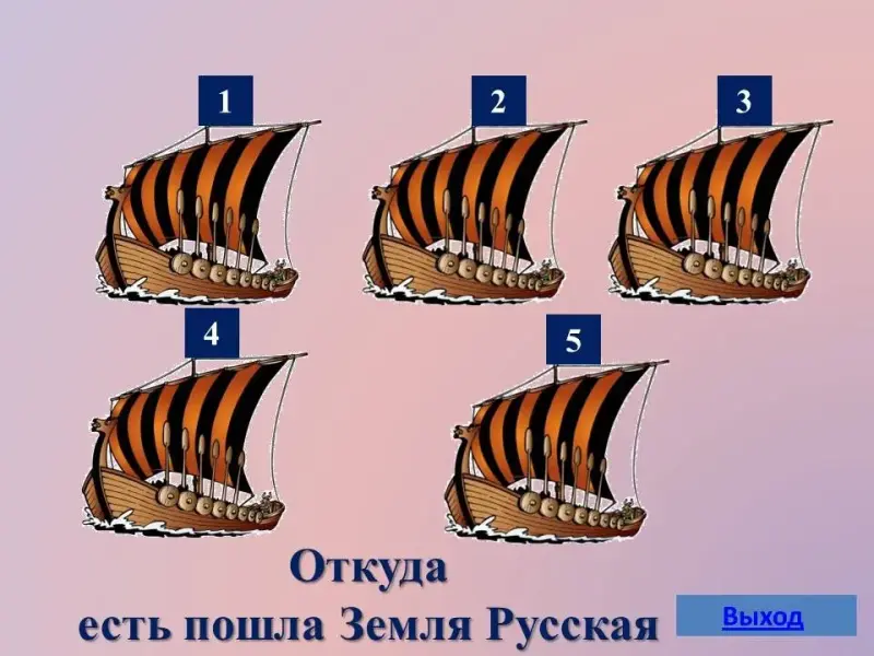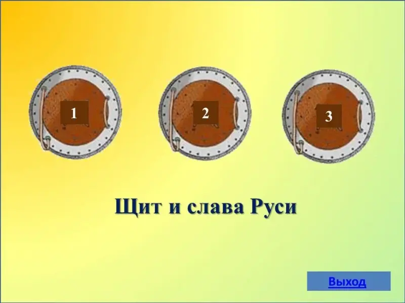 В презентации стартовой страницей является 2 слайд, который представляет собой поле, состоящее из пяти разделов: "Откуда есть пошла Земля русская", "Щит и слава Руси", "Смутное время", "Символы государства", "Правители Руси". При щелчке левой клавишей мыши по выбранному номеру осуществляется переход на слайд с вопросом. Правильность ответа можно проверить, щелкнув по кнопке "Ответ". Возврат на стартовую страницу осуществляется щелчком по кнопке "Корабль" в 1 категории, "Меч" во 2 категории, "Квадрат" в 3 категории, "Играть дальше в 4 категории, "Квадрат" в 5 категории.