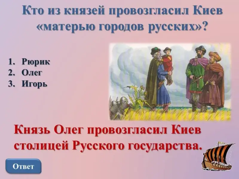 Когда Рюрик умер, его сын Игорь был совсем маленьким ребенком и не мог сам править. Поэтому князем стал родственник Рюрика Олег. А на Днепре, в Киеве в то время правили князья Аскольд и Дир. Олег решил объединить Киев и Новгород. Взяв с собой маленького Игоря, Олег вместе со своими дружинниками отправился в Киев. Одевшись купцом, он приплыл в Киев и сообщил князьям, что привез им диковинные заморские товары и хочет принести богатые дары. Олег пригласил Аскольда и Дира на берег к своей ладье. А сам под лавками спрятал дружинников с оружием. Аскольд и Дир пошли, думая, что мирные "купцы" не опасны. Но тут выскочили спрятавшиеся воины Олега и убили правителей Киева. Олег стал правителем сделал Киев столицей Русского государства. Он в 882 году провозгласил Киев "матерью городов русских"[1]