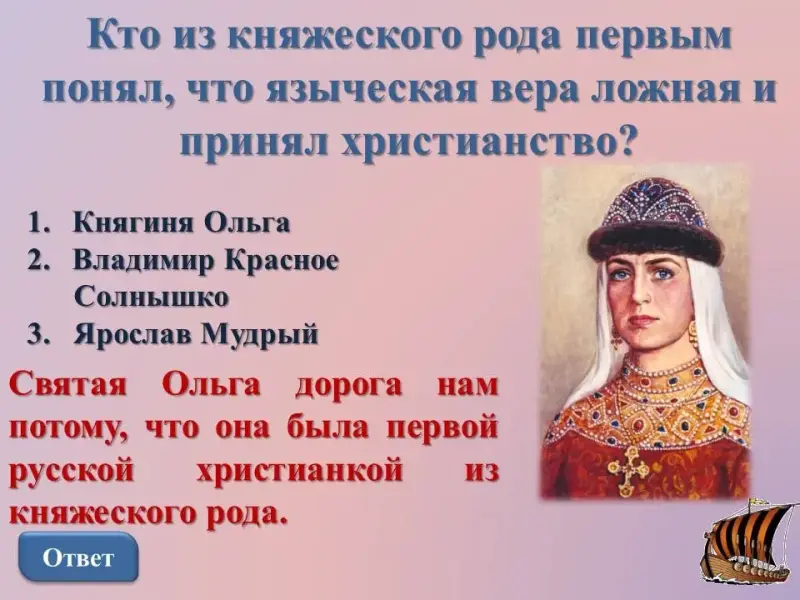 Среди киевлян в то время многие были христианами; из разговоров с ними Ольга поняла, что ее языческая вера - ложная, а христианская - истинная.