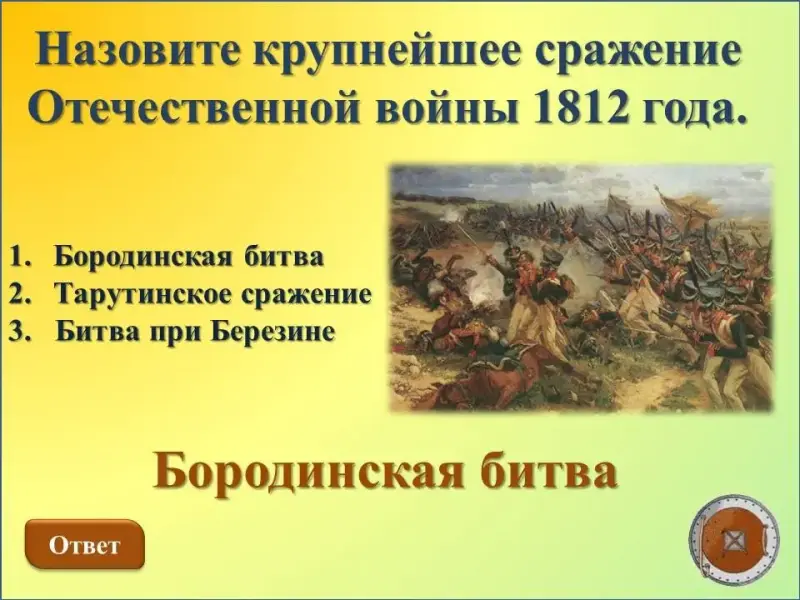 Назовите крупнейшее сражение Отечественной войны 1812 года.