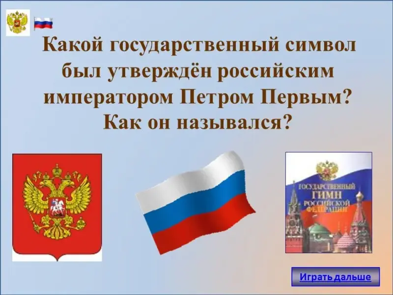 - Вопрос 2 - слайд 21. Какой государственный символ был утверждён российским императором Петром Первым? Как он назывался?