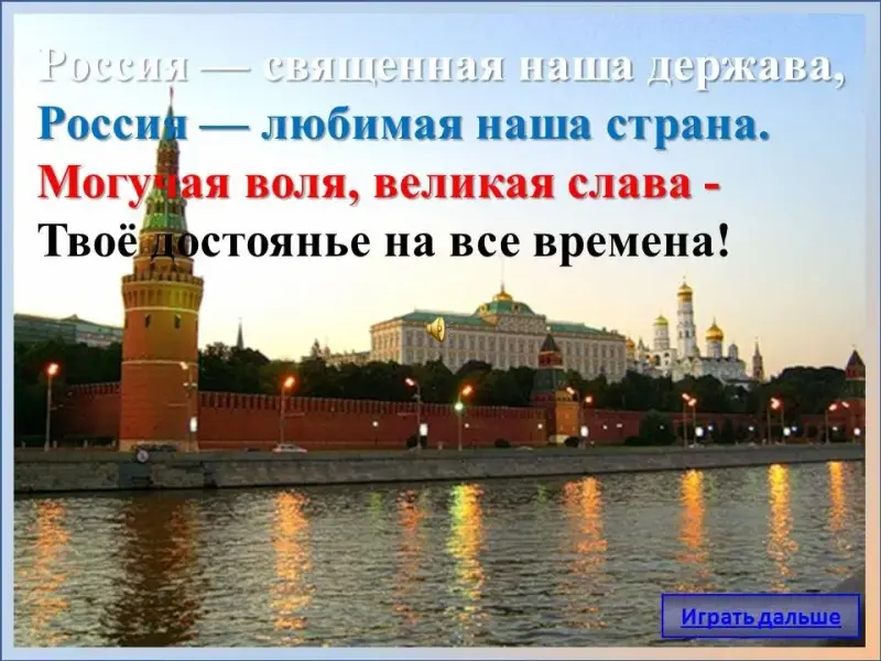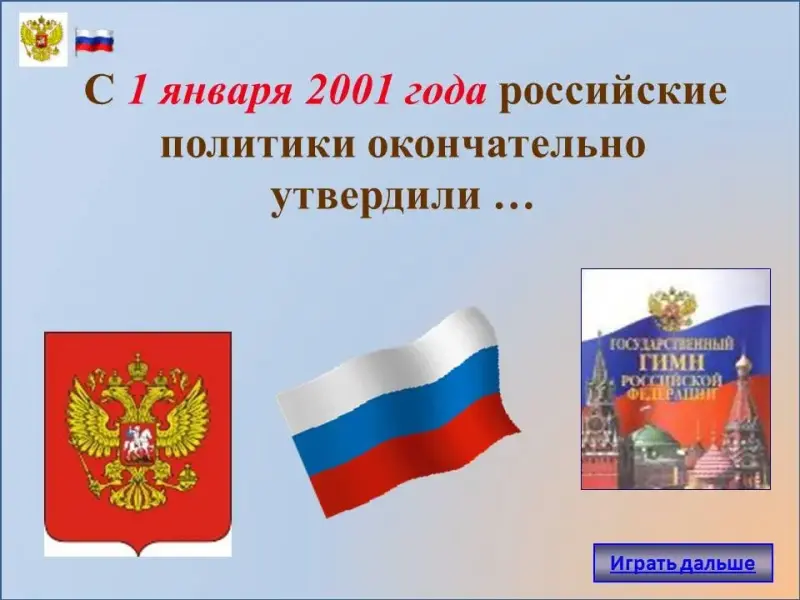 - Вопрос 3 - слайд 22. С 1 января 2001 года российские политики окончательно утвердили государственный гимн России на слова С.В. Михалкова и музыку А.В. Александрова.