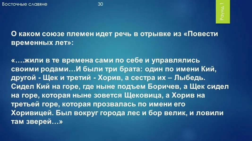 Вопрос 30: О каком союзе племен идет речь в отрывке из "Повести временных лет":"....жили в те времена сами по себе и управлялись своими родами...И были три брата: один по имени Кий, другой - Щек и третий - Хорив, а сестра их - Лыбедь. Сидел Кий на горе, где ныне подъем Боричев, а Щек сидел на горе, которая ныне зовется Щековица, а Хорив на третьей горе, которая прозвалась по имени его Хоривицей. Был вокруг города лес и бор велик, и ловили там зверей..." Ответ: Поляне