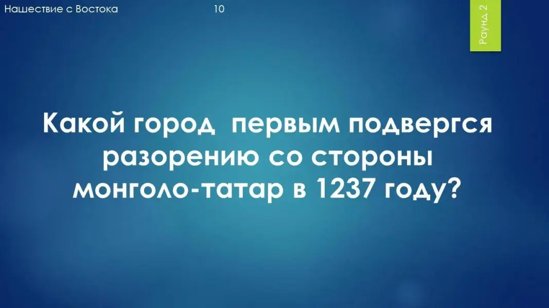 Вопрос 10: Какой город первым подвергся разорению со стороны монголо-татар в 1237 году? Ответ: Рязань