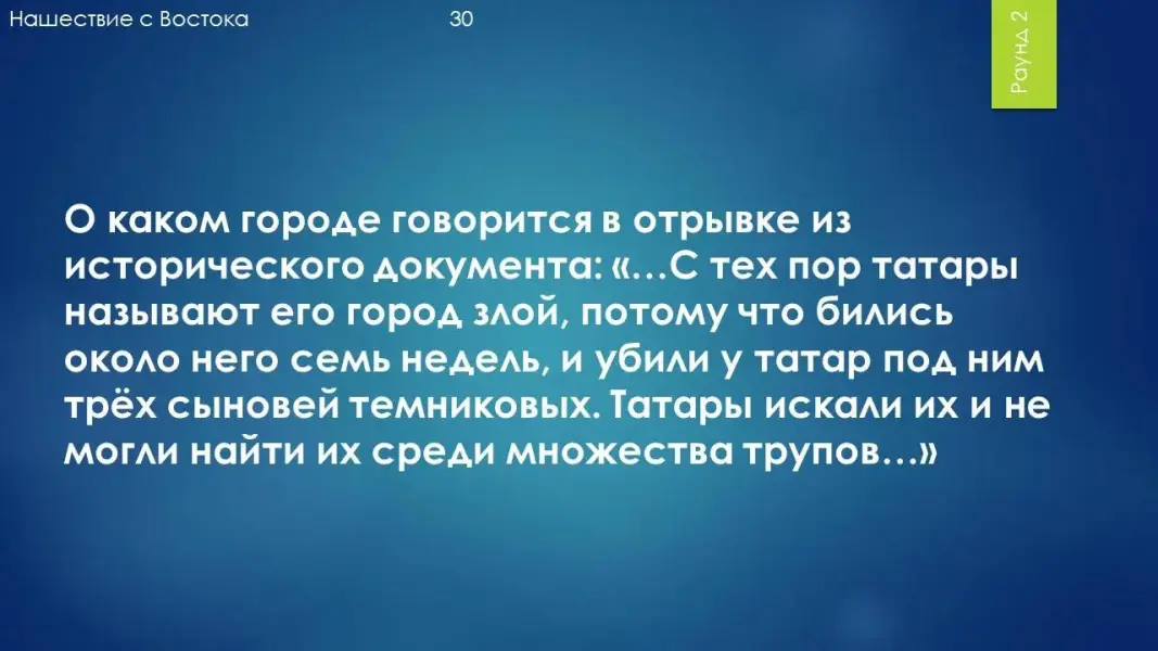 Вопрос 30: О каком городе говорится в отрывке из исторического документа: "...С тех пор татары называют его город злой, потому что бились около него семь недель, и убили у татар под ним трёх сыновей темниковых. Татары искали их и не могли найти их среди множества трупов..." Ответ: Козельск