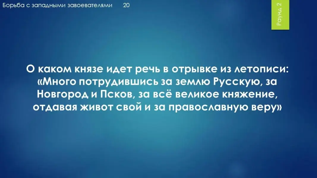 Вопрос 20: О каком князе идет речь в отрывке из летописи: "Много потрудившись за землю Русскую, за Новгород и Псков, за всё великое княжение, отдавая живот свой и за православную веру"? Ответ: Александр Невский