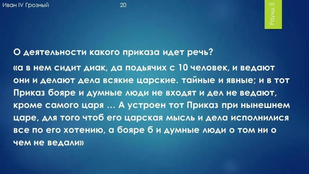 "а в нем сидит диак, да подьячих с 10 человек, и ведают они и делают дела всякие царские. тайные и явные; и в тот Приказ бояре и думные люди не входят и дел не ведают, кроме самого царя ... А устроен тот Приказ при нынешнем царе, для того чтоб его царская мысль и дела исполнилися все по его хотению, а бояре б и думные люди о том ни о чем не ведали". Ответ: Приказ тайных дел