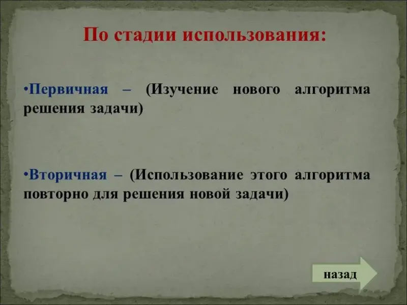 Класс делится на три команды, каждая выстраивается в ряд. Первому учащемуся в каждом ряду сообщается информация (слова `компьютер` и `алгоритм`), и они передаются по ряду каждому от второго до последнего: