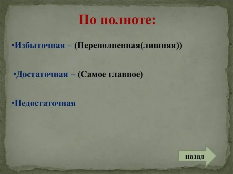 - Полнота - информация полна, если её достаточно для принятия решения и понимания