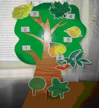 Педагог показывает лист какого-либо дерева, просит назвать это дерево. После этого им предлагается определить на слух количество звуков в названии дерева. Если ребенок справляется с заданием, он прикрепляет лист на ветку с цифрой, соответствующей количеству звуков в названии дерева. Например, "дуб" - 3, "липа" - 4, "клён" - 4 и т.д.