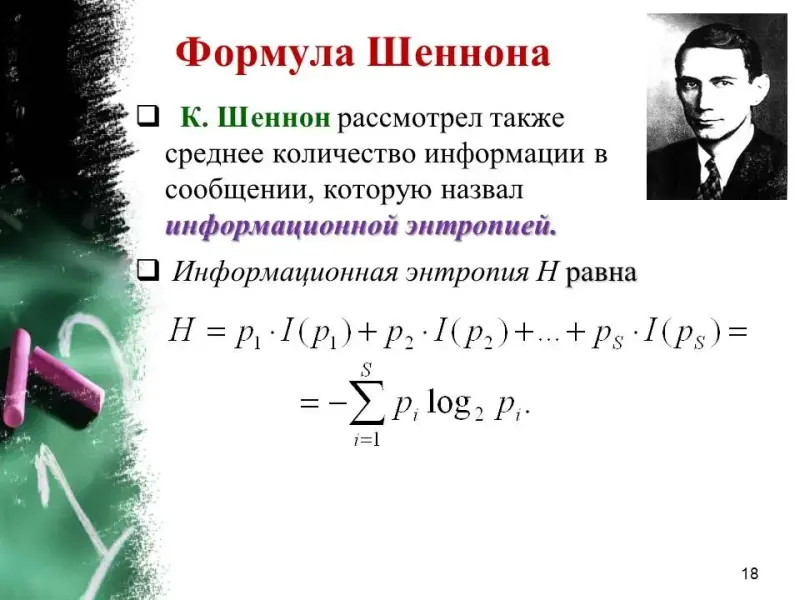 В своей основополагающей работе "Математическая теория связи" (1948 год) (см. [1]) К. Шеннон рассмотрел также среднее количество информации в сообщении, которую назвал информационной энтропией.