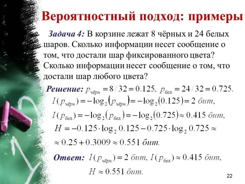Задача 2: В корзине лежат 8 чёрных и 24 белых шаров. Сколько информации несет сообщение о том, что достали шар фиксированного цвета? Сколько информации несет сообщение о том, что достали шар любого цвета?