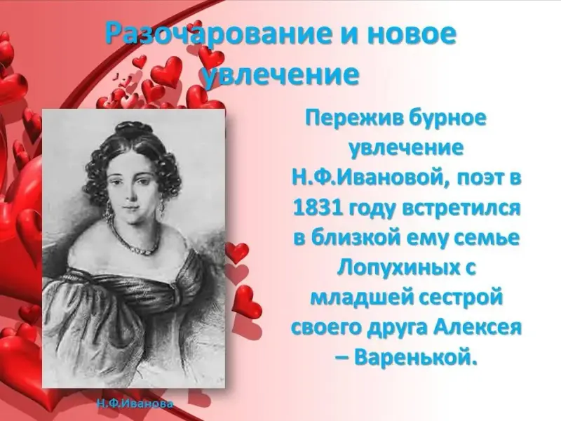 Когда молодые люди полностью осознали свои чувства (и кто пришел к этому раньше), сказать сложно. Их любовь крепла постепенно. Ее не сломила даже бурная страсть Лермонтова к Наталье Ивановой, дочери драматурга Федора Иванова (та самая загадочная Н. Ф. И., которой влюбчивый и восприимчивый поэт посвятил немало стихотворений). Познакомились они предположительно летом 1831 года. И Лермонтов, слегка призабыв былую привязанность к Вареньке, с головой окунулся в пучину новых страстей. Ему казалось: вот это оно, это все, это счастье...