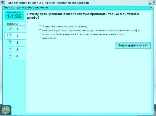 Учитель с учащимися вспоминают основные правила ТБ и затем проводят инструктаж, используя компьютерные тесты (ЦОР: Химия 8 - 11 класс. Виртуальная лаборатория. "Ароматические углеводороды"). Тестовые задания проецируются на экран, и учащиеся отвечают на вопросы теста.