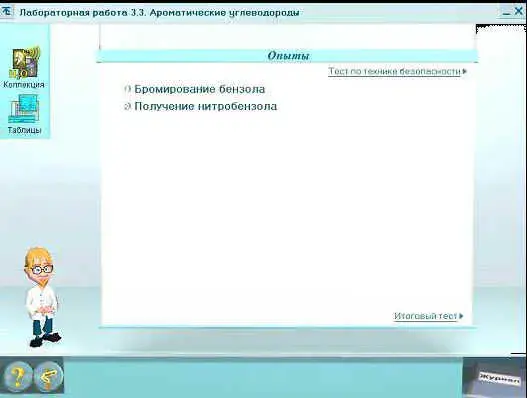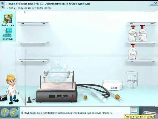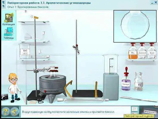Учитель: Итак, мы с вами разобрали класс ароматических углеводородов, узнали об их особенностях, об их получении, свойствах и применении. И теперь мы с вами проведем практическую работу по ароматическим углеводородам. Но так как работать с бензолом и другими аренами очень опасно, из-за того, что это токсичная и ядовитая жидкость, работать мы будем в виртуальной лаборатории, с проведением в реализованной на экране монитора лаборатории со всем оборудованием и химической посудой, а также химическими реагентами.