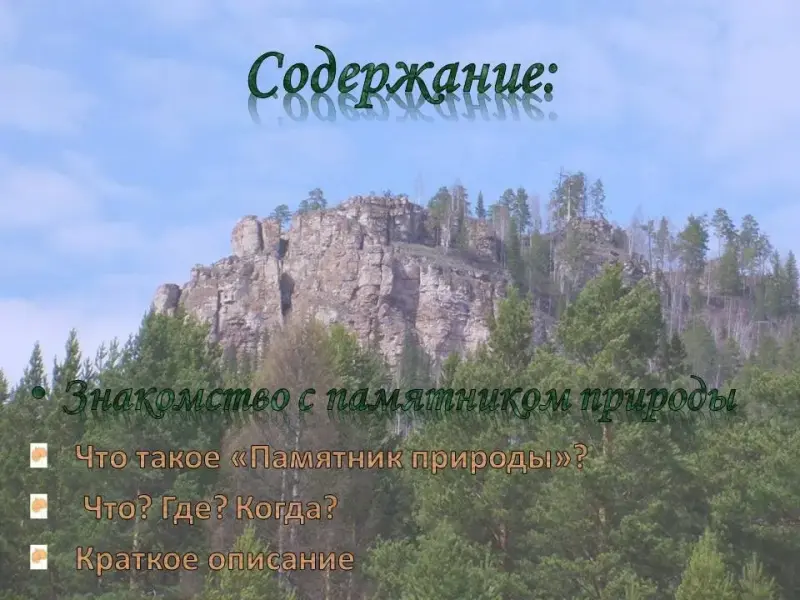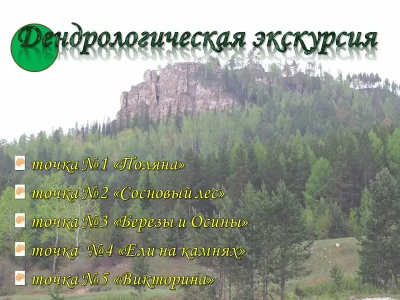 Дополнительная информация: На 3-ем слайде указан перечень вопросов, которые будут рассмотрены в разделе, посвященном памятнику природы скала "Мир". На 4-ом слайде представлено краткое содержание дендроэкскурсии. Эти два слайда заменяют "информационный щит", который устанавливается в начале экологической тропы.