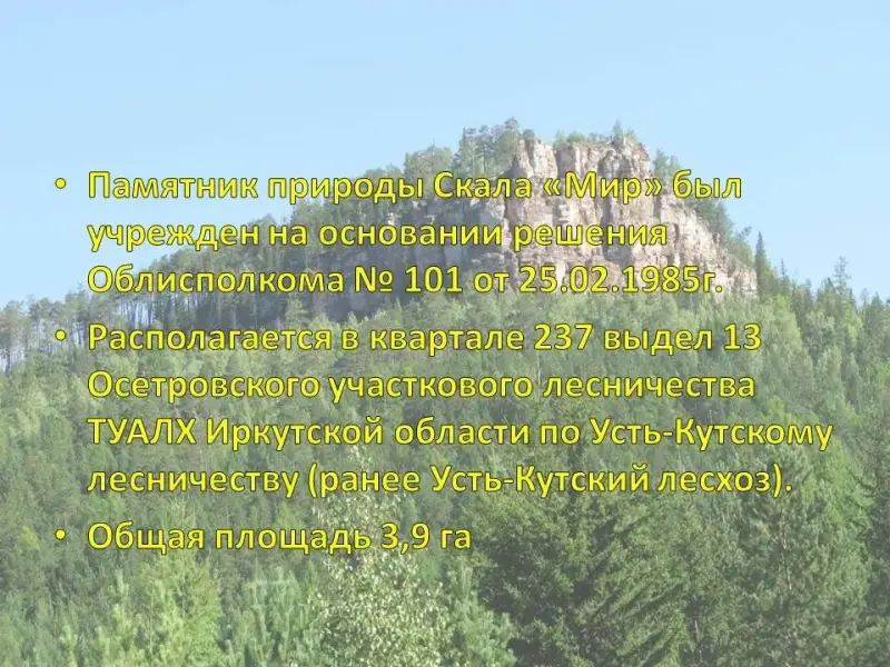 - Памятник природы скала "Мир" был учрежден на основании решения Облисполкома № 101 от 25.02.1985г.