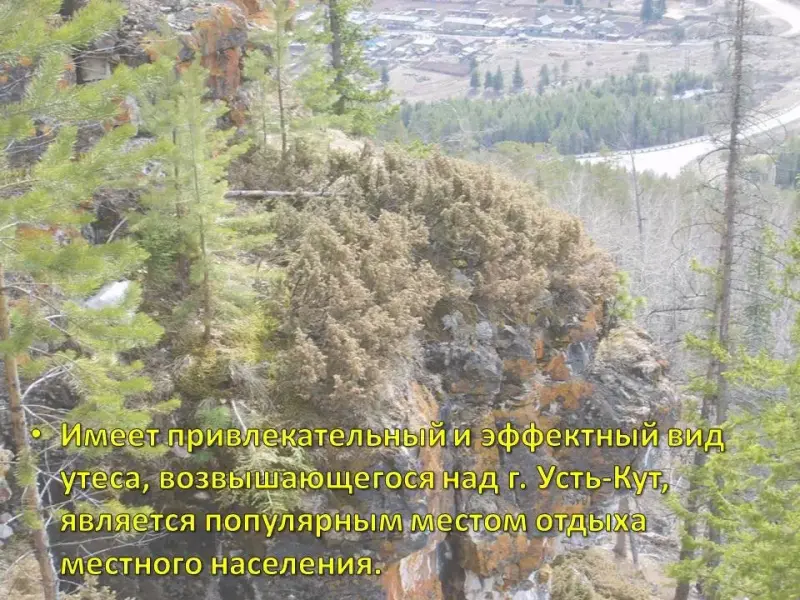 6 слайд - Имеет привлекательный и эффектный вид утеса, возвышающегося над городом Усть-Кут, и является популярным местом отдыха местного населения.
