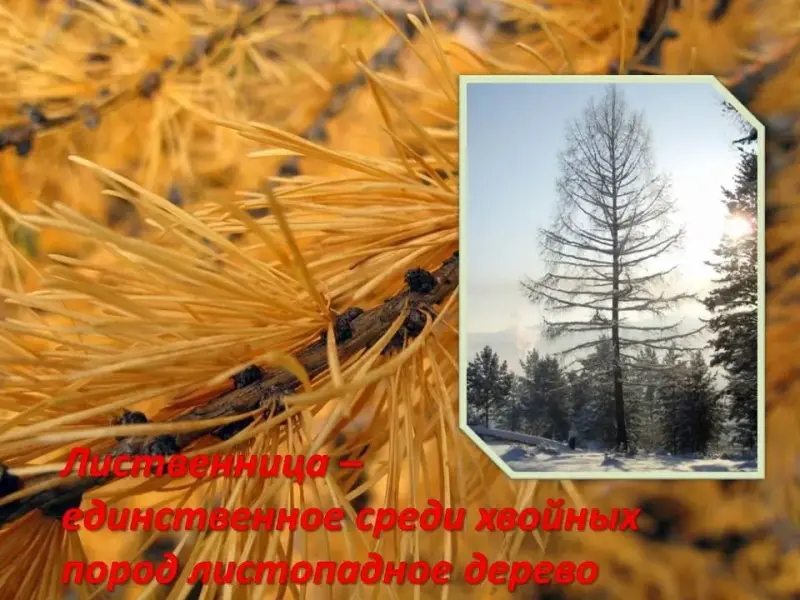Дополнительная информация: На слайде изображена веточка лиственницы с осенней, желтой хвоей и размещена фотография, общего вида дерева в зимний период.