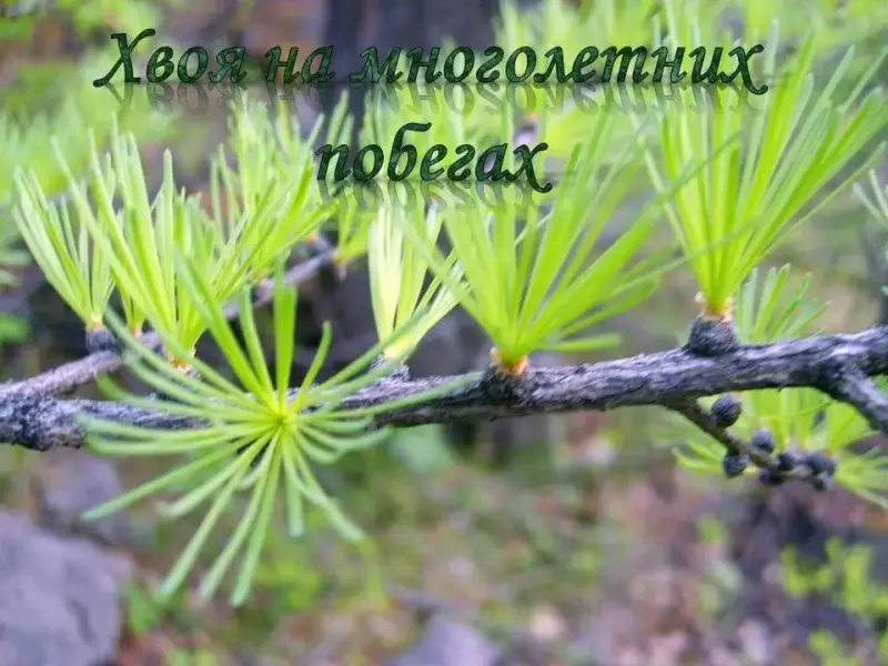 Дополнительная информация (к слайду 14 и 15): Необходимо обязательно обратить внимание детей на разницу между укороченным и удлиненным побегом, для этого можно раздать образцы веточек лиственницы в зимний и летний период и провести их сравнение.