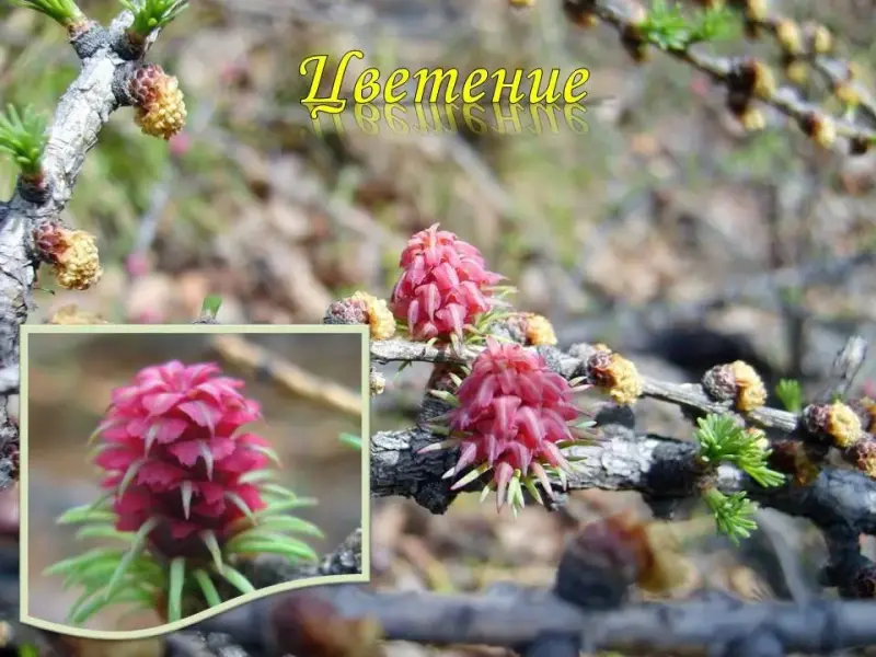 Внешне эти соцветия лиственницы похожи на шишечки, женские - ярко-красного цвета, а мужские желтого. Расположены они на одних и тех же веточках. Цветет лиственница одновременно с распусканием хвои.