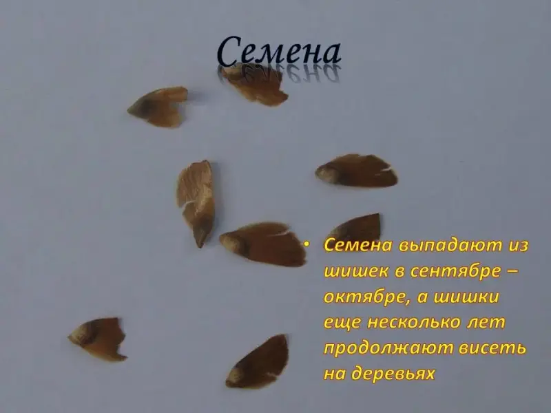 Дополнительная информация: можно раздать образцы семян лиственницы и подробно рассмотреть их строение, и то, как крылышко отделяется от семечка (поскольку это основной диагностический признак при определении семян хвойных пород). Раздать семена можно даже в том случае если в конце занятия планируется проведение лабораторной работы по определению семян хвойных пород, тогда детям будет легче самостоятельно выполнить лабораторную работу. На слайде размещена фотография семян лиственницы из коллекции семян хвойных пород.