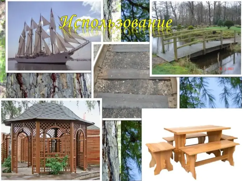 18 слайд - Древесина лиственницы устойчива против гниения, хорошо обрабатывается, меньше других хвойных пород разбухает и ссыхается. Благодаря качествам своей древесины (поразительной устойчивости к гниению) используется в гидротехнических сооружениях, в судостроении, а также идет на шпалы, столбы, рудничную стойку, на постройку жилых и хозяйственных зданий, на изготовление мебели.