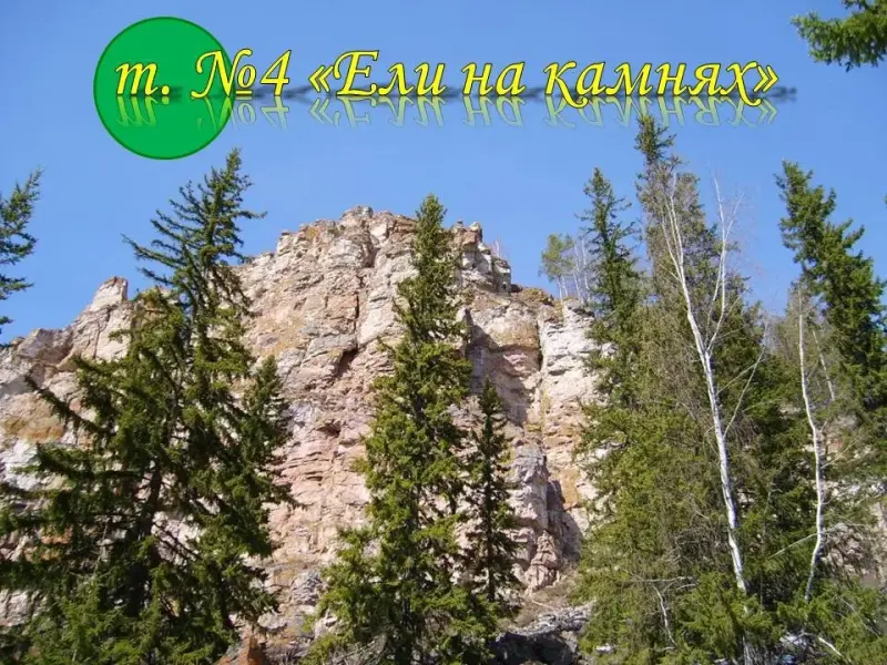 8 слайд - Экологическая тропа начинается у дороги "Усть-Кут - Звездный", здесь же расположена первая точка наблюдения, "Поляна". Далее поднимаясь вверх по склону, мы познакомимся с сосновым лесом, небольшим участком лиственного леса, ельником и разнообразной растительностью каменной осыпи расположенной у основания скалы "Мир". Маршрут оканчивается на вершине скалы "Мир".