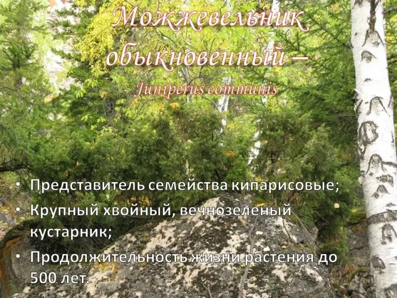 | Назовите единственный хвойный кустарник, который произрастает в наших лесах. | Можжевельник |