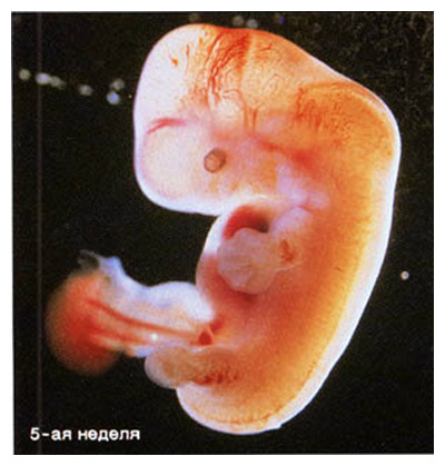 | 5-7 неделя | Формируются лица, нос, глаза, уши, руки зародыша, появляются позвонки вокруг хорды, пальцы, соединенные плавательными перепонками. Формируется 4х камерное сердце, исчезает хвост и жаберные щели, появляются ногти. Зародыш достигает 2,5 см. с этого момента его называют плодом, происходит его непрерывный рост и развитие. <Рисунок 5> |