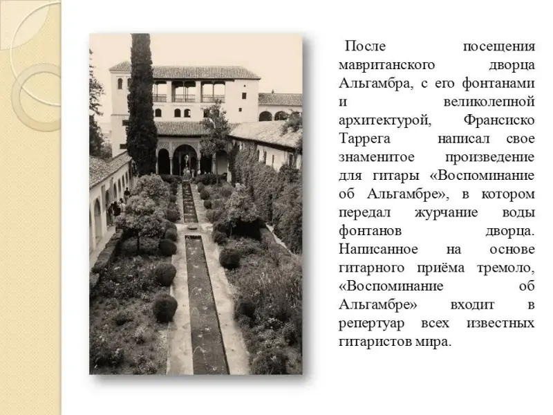 К середине девятнадцатого века после многих усовершенствований основным инструментом концертных залов становится рояль. Прочно удерживает свое место и скрипка. 50-е годы XIX века отмечены спадом гитарной лихорадки. За исключением Англии, где гитара по-прежнему пользуется успехом, в остальной части Европы она вытесняется фортепиано. Для гитары наступает время упадка. Выступления гитаристов привлекают все меньше и меньше слушателей. Общественное мнение резко меняется: пойти на концерт гитариста означало явить низкий вкус. Гитару стали считать неблагородным инструментом, отвернулось от нее и большинство композиторов. Мало-помалу гитара во всех странах, разве что кроме Испании, ушла с концертных подмостков. К счастью, период упадка длился всего несколько десятилетий. А затем начался стремительный расцвет. И начало расцвета в первую очередь связано с именем Франсиско Таррега-и-Эмшеа - испанский классический гитарист и композитор, один из основоположников современного исполнительства на этом инструменте. В 1862 году Франсиско Таррега начал учиться игре на гитаре у Хулиана Аркаса. Достигнув некоторых успехов, Таррега смог приобрести в 1869 году гитару работы мастера Антонио Торреса, а в 1874 поступить в Мадридскую консерваторию в классы фортепиано и композиции, гитара в консерватории не преподавалась. В 1880 году Таррега окончил консерваторию и начал карьеру концертирующего гитариста, начало которой положил его сольный концерт в мадридском театре "Альгамбра", прошедший с огромным успехом. Занимаясь на гитаре по нескольку часов в день, он виртуозно овладел всеми найденными до него приемами игры и разработал собственные. Таррега пришел к выводу, что не раскрыта широчайшая звуковая палитра гитары, а ведь тембровая окраска звука, тончайшие звуковые нюансы важны так же, как техника исполнения. По-новому осмыслив гитару, он способствовал тому, что она вновь обрела заинтересованных слушателей и стала концертным инструментом. После концертов Таррега в Лондоне, Париже, Лионе, музыкальные критики назвали его "Сарасате гитары". После женитьбы в 1882 году Таррега живет в Барселоне, где занимается педагогической, концертной и композиторской деятельностью. В Барселоне сформировались творческие союзы Таррега с Энрике Гранадосом и Исааком Альбенисом, многие их сочинения он переложил для гитары. На рубеже XIX-XX веков гитарист давал многочисленные концерты в Испании, но в 1906 году после инсульта у него наступил паралич правой половины тела. Несмотря на то, что он вернулся к концертной деятельности, полностью выздороветь ему так и не удалось. Среди учеников и последователей Таррега - Мигель Льобет, Эмилио Пухоль, Даниэль Фортеа и другие известные гитаристы. Эмилио Пухоль, сам стал впоследствии крупнейшим педагогом гитары, профессором консерваторий в Барселоне и Лиссабоне, автором книги о своем учителе и, самое главное, автором серьезнейшей школы игры на шестиструнной гитаре, которая была построена на принципах техники Тарреги. Высоко ценил мастерство Таррега Андрес Сеговия, часто исполнявший его сочинения и использовавший в своей работе его педагогические методы.