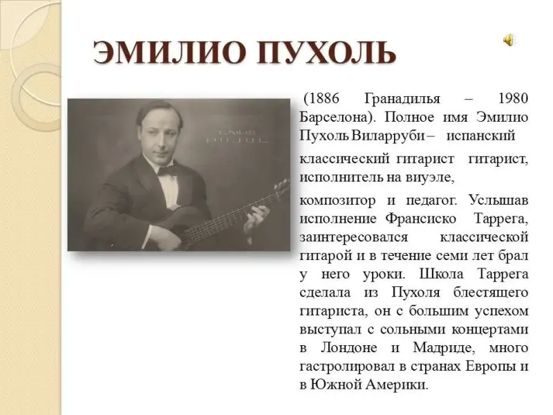 Эмилио Пухоль Виларруби родился 7 апреля 1886 года около испанского города Lerida, в маленькой деревне с именем Granadella. Эмилио Пухоль Виларруби - один из самых известных учеников легендарного гитариста Франсиско Тaррега. Считается виднейшим представителем гитарной школы двадцатого столетия. Оценивая его сольные концерты в Испании и за рубежом, музыкальные критики двадцатых годов ставили Пухоля в один ряд со знаменитыми актерами. Пухоль начал свои занятия музыкой с изучения сольфеджио в возрасте пяти лет. Его учителем стал руководитель местного крестьянского оркестра. В 1897 Пухоль начал учится игре на бандуррии. В 1901 году пятнадцатилетний Пухоль начал обучаться у Франсиско Таррега. Обучение Пухоля продлилось, до 1907 года, серьезное заболевание Таррега помешало последующим занятиям. С 1912 по 1929 годы концертная деятельность Пухоля проходила преимущественно в Западной Европе. В связи с Первой мировой войной, он мало путешествовал и главным образом оставался в Каталонии, но в начале 1918 года он предпринял тур по Южной Америке, начинавшийся с Буэнос-Айреса. С 1935 до 1940 Пухоль продолжал устраивать концерты и лекции в Испании, Лондоне и Париже. В 1946 Пухоль открывает высший класс гитары в Лиссабонской Консерватории Музыки. Это первый случай включения гитары в курс академического учреждения. Барселона стала последним пристанищем этого замечательного гитариста, педагога и историка. В противоположность своему современнику Андресу Сеговии, игравшему исключительно ногтями, Пухоль придерживался техники Таррега, предпочитавшего извлекать звук подушечками пальцев, достигая более мягкого, но и более ограниченного по тембру звучания. Наследие Пухоля включает в себя множество оригинальных сочинений и переложений для гитары, а также "Школа игры на гитаре", неоднократно переизданная и не потерявшая своей ценности по сей день.