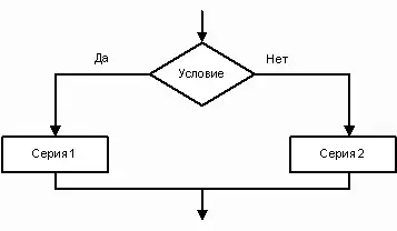 В алгоритмическую структуру "ветвление" входит условие, в случае истинности условия реализуется последовательность команд Серия 1; в случае ложности - последовательность команд Серия 2.