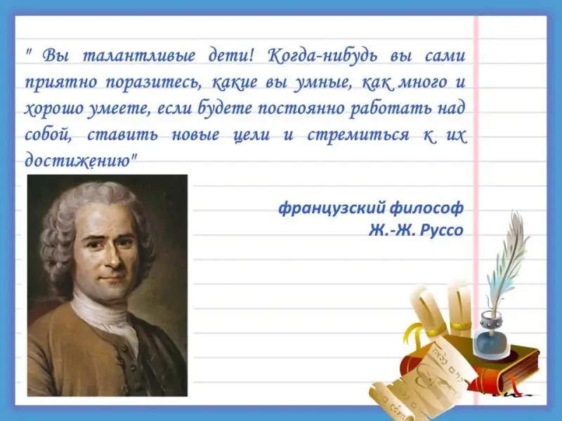 Великий французский философ Ж.-Ж. Руссо говорил: "Вы - талантливые дети! Когда-нибудь вы сами приятно поразитесь, какие вы умные, как много и хорошо умеете, если будете постоянно работать над собой, ставить новые цели и стремиться к их достижению".