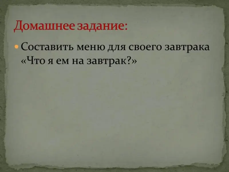 6. Домашнее задание: составить меню для своего завтрака "Что я ем на завтрак?" (для более сильных учащихся) (слайд 14)