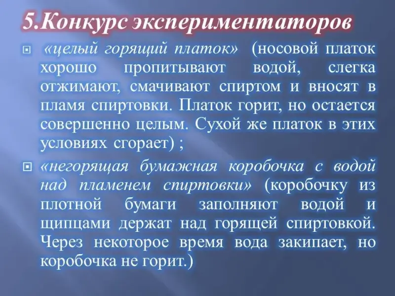 "негорящая бумажная коробочка с водой над пламенем спиртовки" (коробочку из плотной бумаги заполняют водой и щипцами держат над горящей спиртовкой. Через некоторое время вода закипает, но коробочка не горит.)